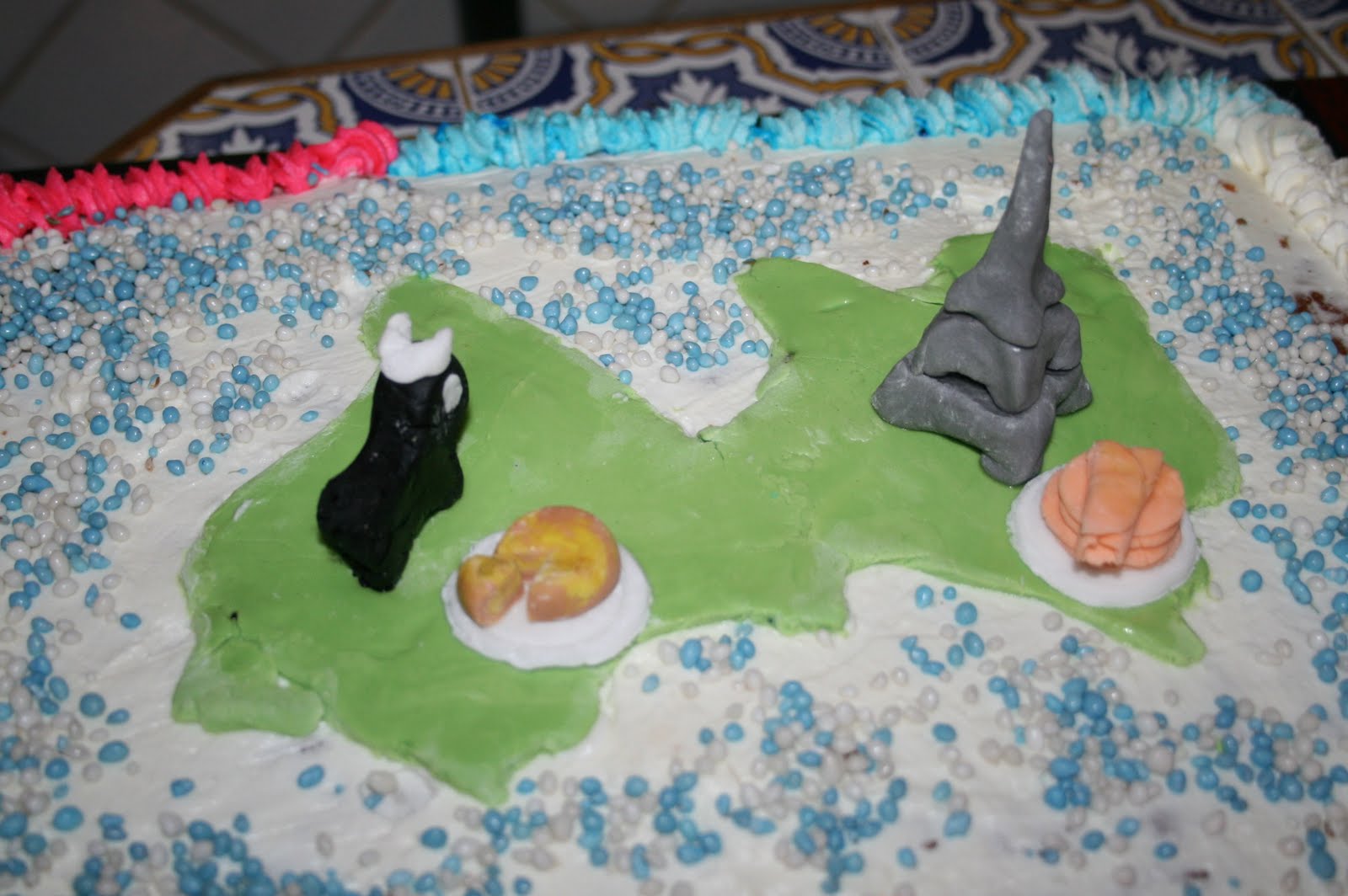 Abrir el bizcocho en tres capas calarlo con el batido rellenarlo con una capa de cacao y otra de nata y decorar con la nata y las figuras de fondant